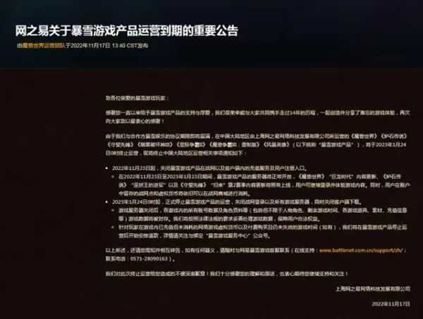 亲爱的暴雪游戏国服玩家,我们很遗憾地通知大家,随着我们与网易公司现有授权协议的到期,所有《魔兽世界》《魔兽争霸 III:重制版》《星际争霸》《炉石传说》《风暴英雄》《守望先锋》《暗黑破坏神 III》国服游戏将于2023年1月24日零时起停止运营。其中《暗黑破坏神 III》受两家公司之间联合开发和发行的另一项协议所涵盖。暴雪表示,希望在将来能重新把暴雪游戏带给大家。